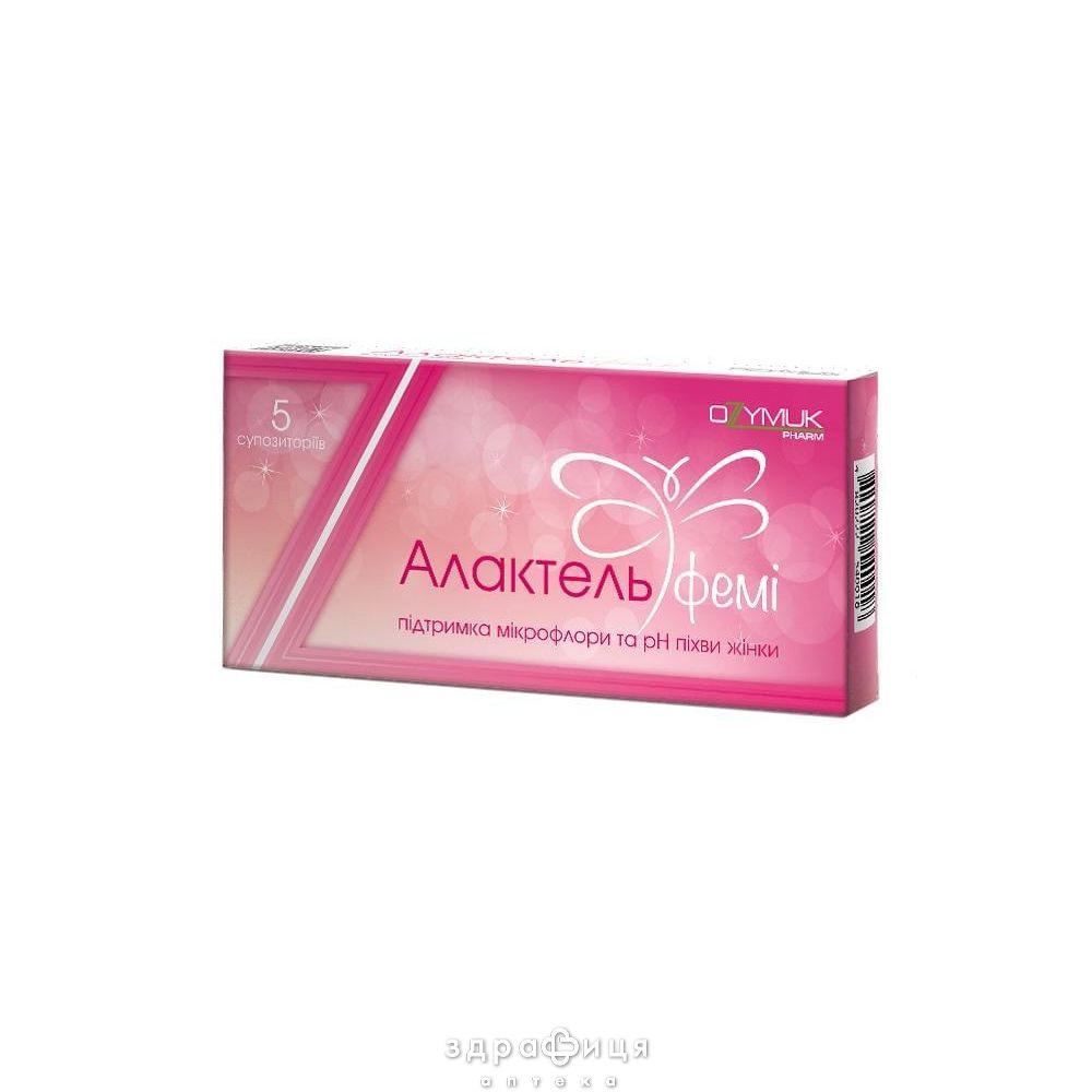 АЛАКТЕЛЬ ФЕМІ СУПП містить бензокаїн, який має місцевоанестезуючу дію, вісмут субгалат, який має антисептичну властивість, цинк оксид, який сприяє загоєнню ран та ментол, який має охолоджуючий ефект.
