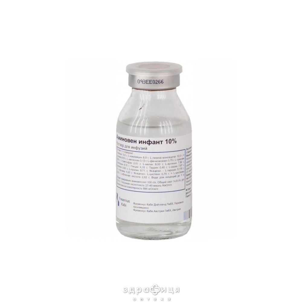 Фармакокінетика. Біодоступність препарату Аміновен інфант 10 % при внутрішньовенному введенні становить 100 %. Амінокислоти включаються у загальний пул вільних амінокислот організму і розподіляються в інтерстиціальній рідині і міжклітинному просторі органів і тканин. Концентрація вільних амінокислот у плазмі крові і цитоплазмі клітин регулюється у вузьких межах залежно від віку, стану харчування і загального стану хворого. При правильному введенні (повільно і з постійною швидкістю) Аміновен інфант 10 % не порушує баланс амінокислот. При тяжких порушеннях функції печінки і нирок регуляція балансу амінокислот порушується. У таких випадках необхідно використовувати інший склад розчинів амінокислот для парентерального харчування. Лише невелика частина амінокислот елімінується нирками. Період напіввиведення амінокислот з плазми крові значною мірою залежить від віку.