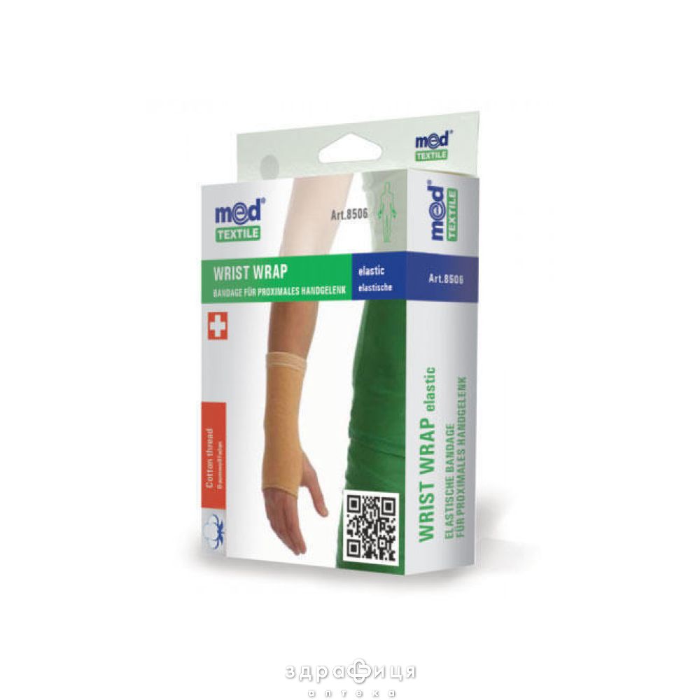 Бандаж на променезап'ястковий суглоб еластичний Медтекстіль 8506 застосовується при травмах лучезапястного суглоба, при ушкодженнях зв'язок, артрозах, артритах, бурситах, синовіту, а також в період реабілітації після гіпсової пов'язки. Також застосовується для профілактики звичних вивихів або травм під час занять спортом.