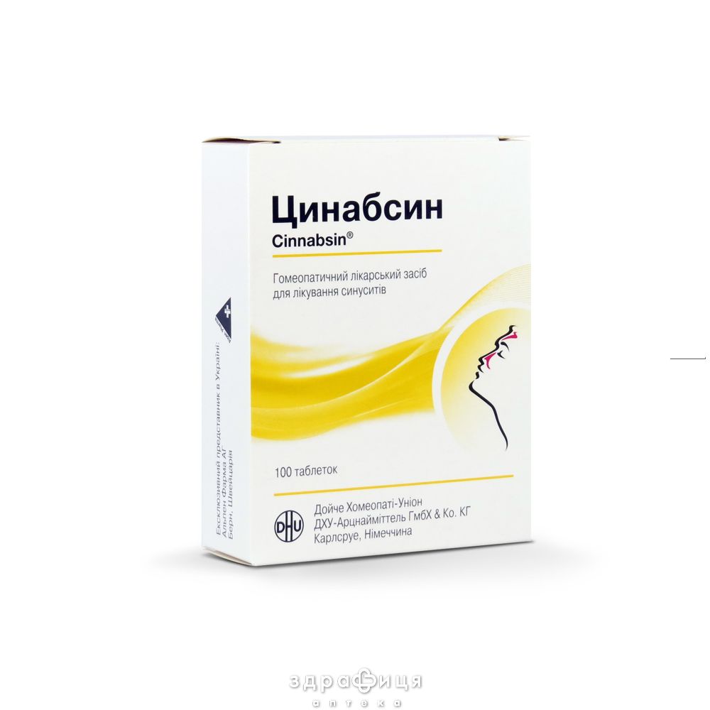 Цинабсин являє собою гомеопатичний комбінований препарат. Cinnabaris швидко і надійно звільняє від таких характерних симптомів запалення навколоносових пазух як головні болі, сльозотеча, а також від невралгій у ділянці обличчя. Hydrastis і Kalium bichromicum діють головним чином при підгострому і хронічному перебігу захворювання, що часто має місце при тривалому синуситі. Усі три інгредієнти сприяють зняттю набряку слизових оболонок і відновленню носового дихання. Echinacea сприяє загальній підтримці імунної системи.