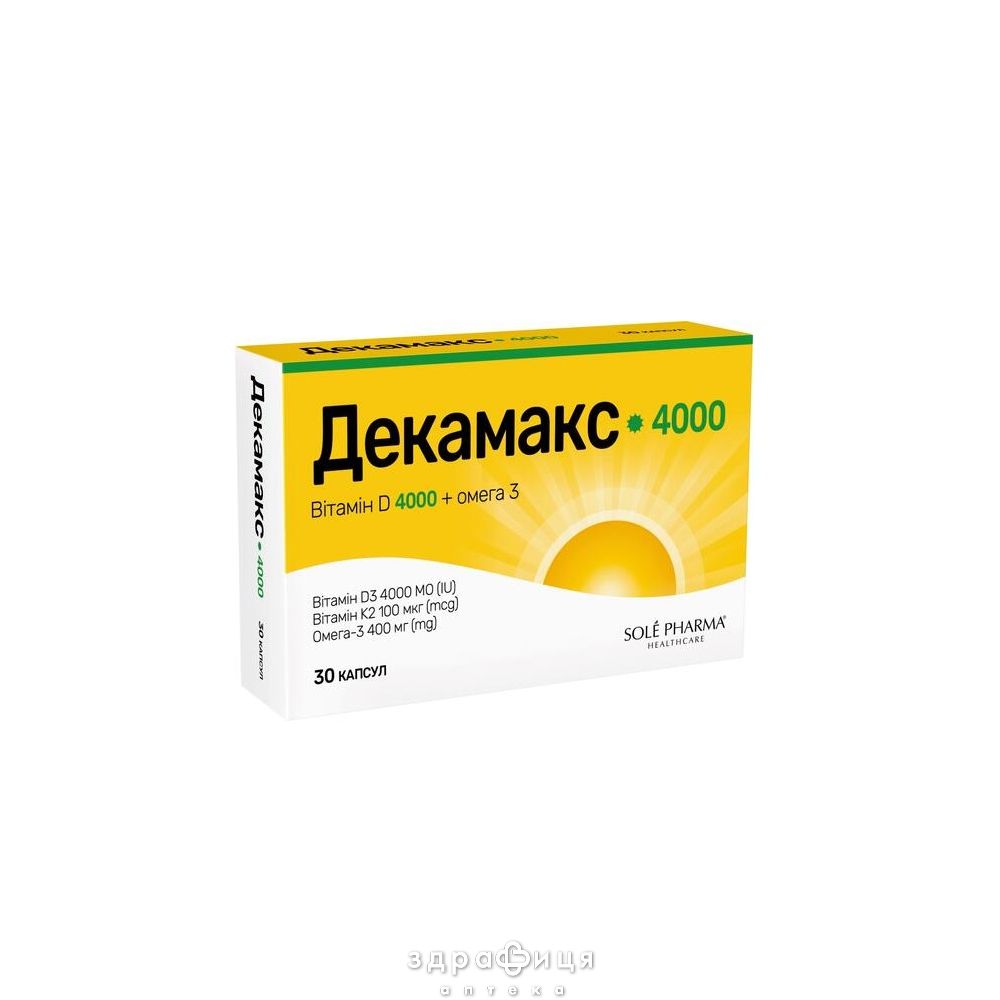Декамакс 4000 рекомендований як додаткове джерело омега-3 поліненасичених жирних кислот (ПНЖК), вітамінів К2 та D3 з метою нормалізації функціонального стану кісток, серцево-судинної системи та метаболізму у цілому при дефіциті вітамінів D3, К2 та ПНЖК, а також при станах, що вимагають додаткового вживання цих речовин (при переломах, остеопорозі, порушеннях засвоєння кальцію, захворюваннях суглобів та щитовидної залози, метаболічному синдромі, порушеннях репродуктивної функції у чоловіків і жінок). Декамакс 4000 сприяє нормалізації ліпідного обміну (зменшенню вмісту тригліцеридів та холестерину у крові). Доцільно вживати особам, які мало часу проводять на сонці.