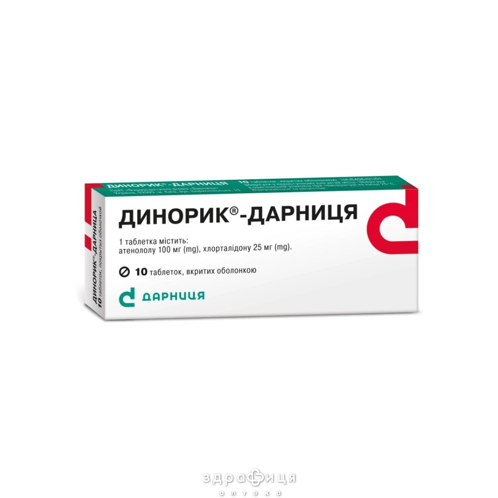 Динорик-дарниця є селективним блокатором β-адренорецепторів у комбінації з діуретиками. Атенолол зменшує артеріальний тиск, а хлорталідон сприяє виведенню надлишкової рідини та солей з організму. Механізм дії полягає у зменшенні серцевої частоти та сили скорочень серця. Фармакокінетика атенололу полягає у швидкому та повному всмоктуванні з ШКТ, а фармакодинаміка виявляється у зниженні артеріального тиску та покращенні серцевої діяльності.