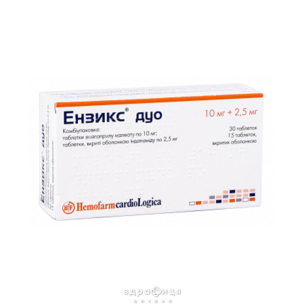 Ензикс® Дуо містить два окремі лікарські засоби в одній упаковці: інгібітор ангіотензинперетворювального ферменту (AПФ) еналаприл і діуретичний засіб індапамід.
