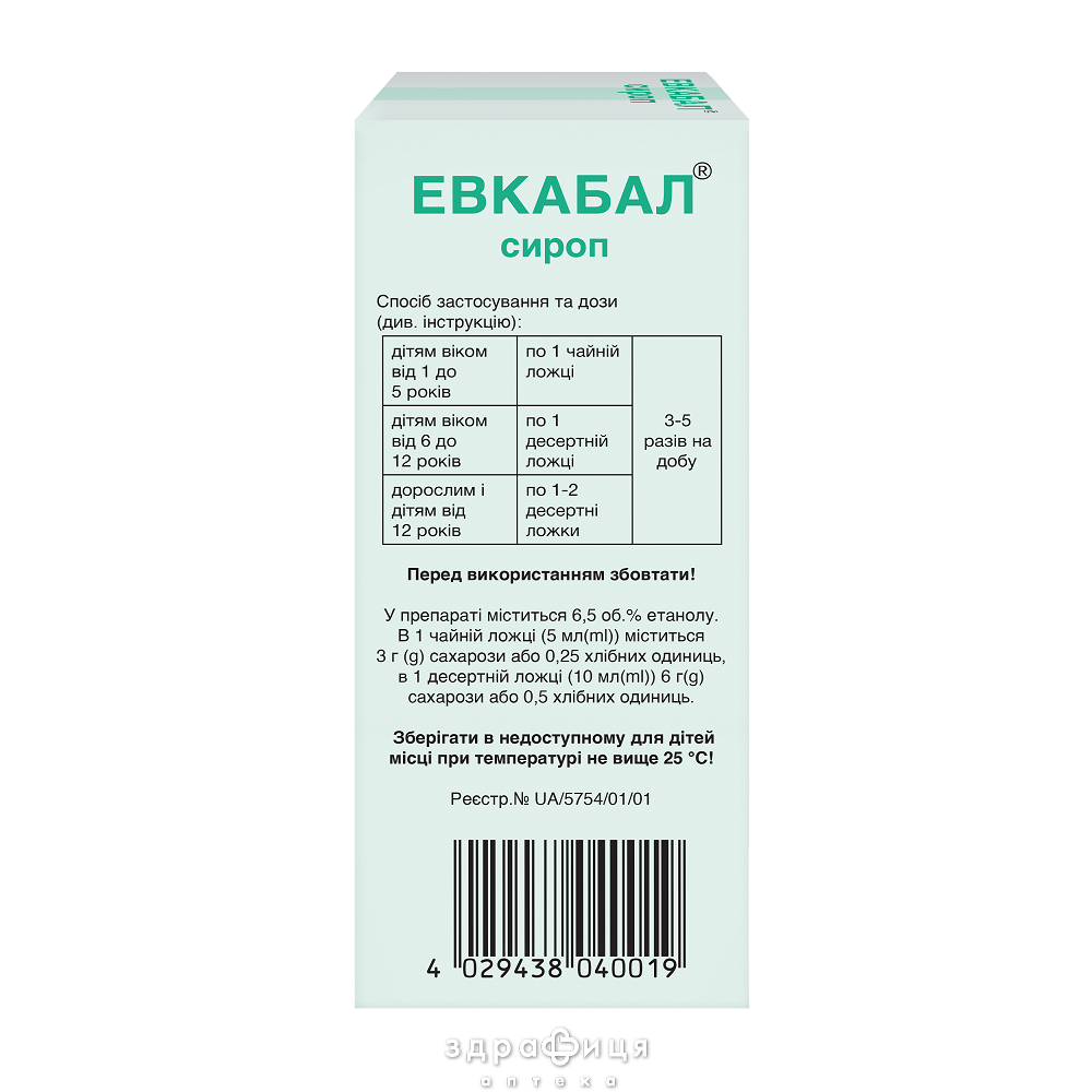 Евкабал® сироп містить глюкозу, фруктозу і сахарозу із загальним вмістом цукру у перерахуванні на сахарозу 0,6 г/мл. Таким чином, в 1 чайній ложці (5 мл) міститься