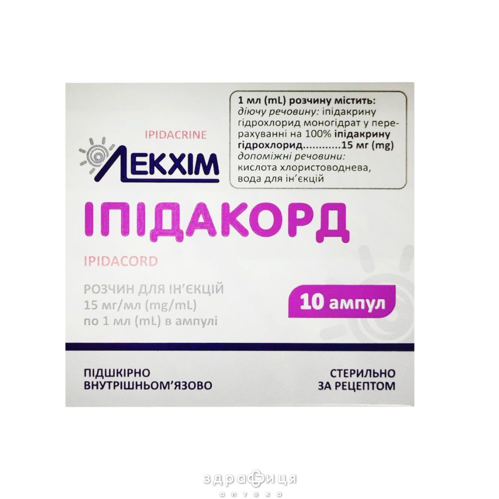 | Склад | 1 мл розчину для ін’єкцій (одна ампула) містить іпідакрину гідрохлорид моногідрат у перерахуванні на 100 % іпідакрину гідрохлорид – 15 мг |