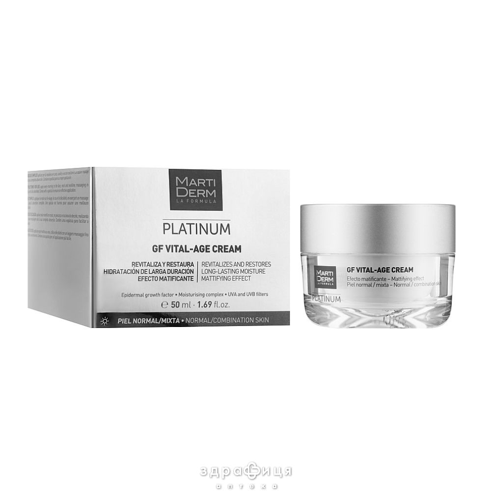 МартіДерм Платинум GF Вітал-аж Крем денний призначений для ефективного відновлює догляду за тьмяною, позбавленої життєвої сили шкірою нормального і комбінованого типу. Продукт надає тривалий глибоке зволоження, заповнюючи недолік вологи в епідермісі та утримуючи її всередині, стимулює природний синтез волокон колагену і еластину, омолоджує і насичує клітини корисними речовинами. MartiDerm Platinum GF Vital-Age Cream for Normal and Combination Skin пом'якшує, живить шкіру, вирівнює її мікрорельєф і колір, освітлює пігментні плями, надає матуючий ефект. Епідермальний фактор росту прискорює процеси регенерації, а також зміцнює і відновлює дерму. Фільтри UVA і UVB захищають шкіру від фотостаріння