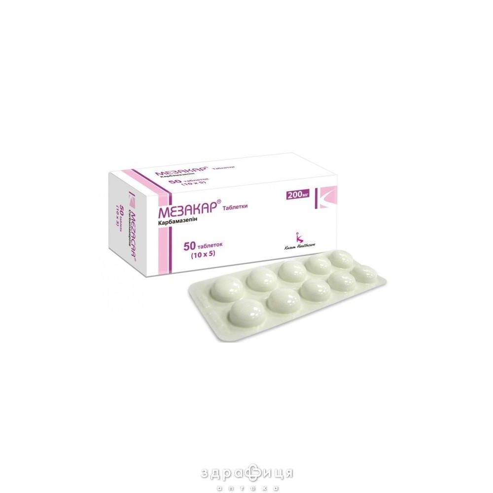 Мезакар таблетки 200 мг використовується для лікування епілепсії, складних або простих парціальних судомних нападів, генералізованих тоніко-клонічних судомних нападів, гострих маніакальних станів та підтримуючої терапії біполярних афективних розладів з метою профілактики загострень. Також може бути використаний для лікування синдрому алкогольної абстиненції та інших неврологічних захворювань.
