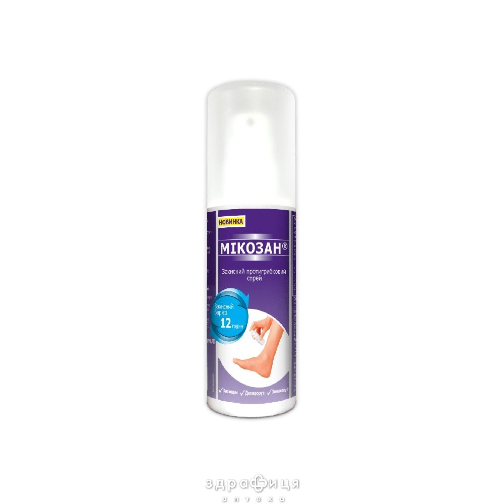 Мікозан захисний протигрибковий спрей призначений для попередження грибкового ураження шкіри ніг протягом 12 год в місцях підвищеного ризику (басейни, сауни, спортзали, роздягальні), для осіб з цукровим діабетом, для попередження повторного грибкового ураження шкіри ніг.