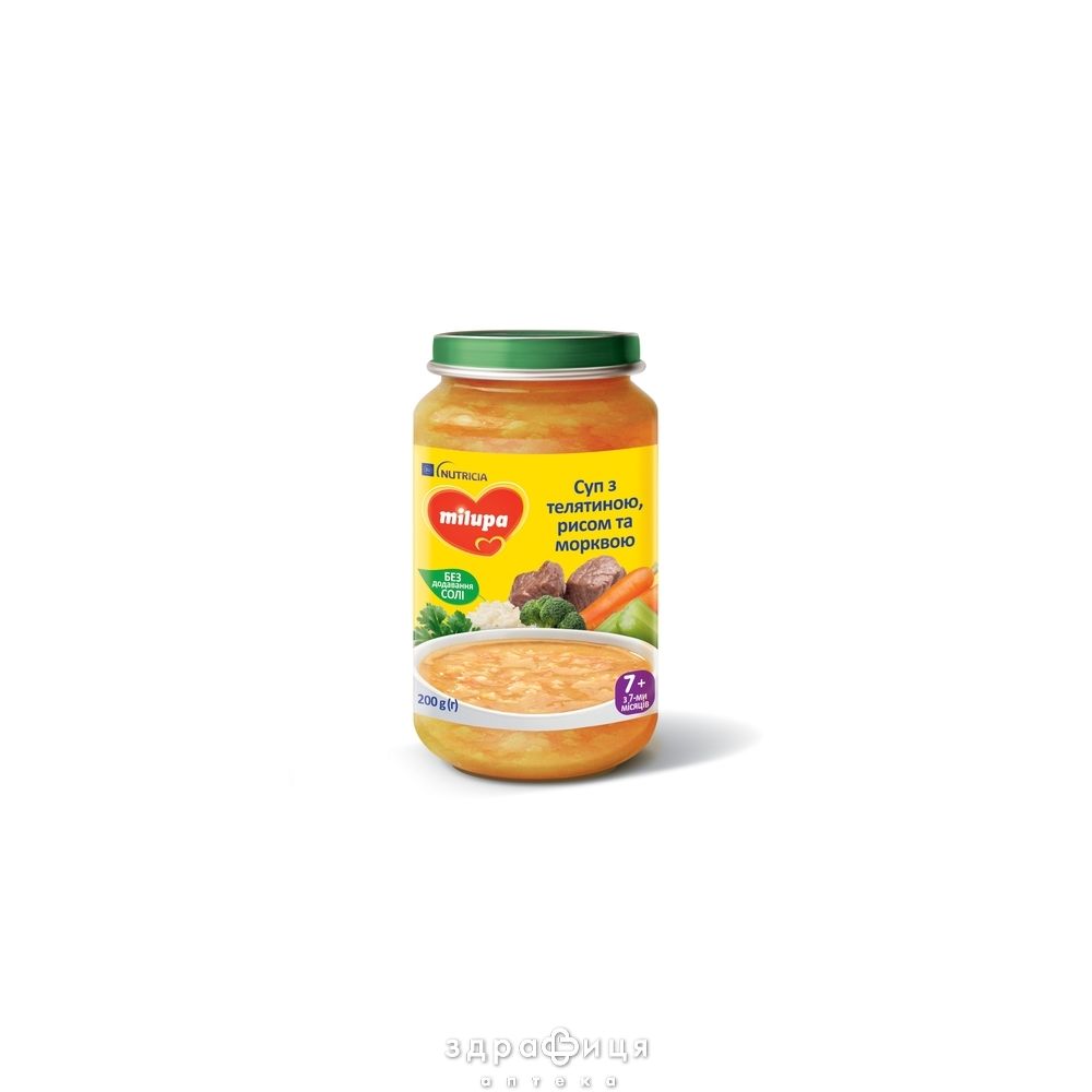 Якщо Ваш малюк вже познайомився з овочевим та м'ясним прикормом, тоді ви можете розширити його меню овочево-м'ясним супом-пюре ."Суп з телятиною, рисом та морквою" - стане справжньою знахідкою для матусь, які шукають повноцінний та смачний обід для свого малюка. Суп гармонійно поєднує користь овочів та м’яса, яке містить цінний білок, залізо та амінокислоти, необхідні для здорового росту та розвитку малюка.