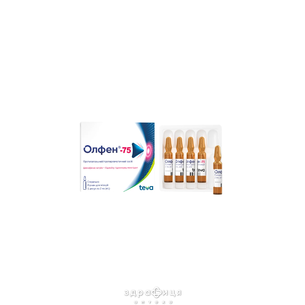 Олфен-75 є нестероїдним протизапальним та протиревматичним засобом. Диклофенак має протизапальну, анальгетичну та антипіретичну дію. Лідокаїн забезпечує місцевий анестетичний ефект. Діючі речовини посилюють один одного, що дозволяє досягти швидкого та ефективного знеболювання та зменшення запалення.