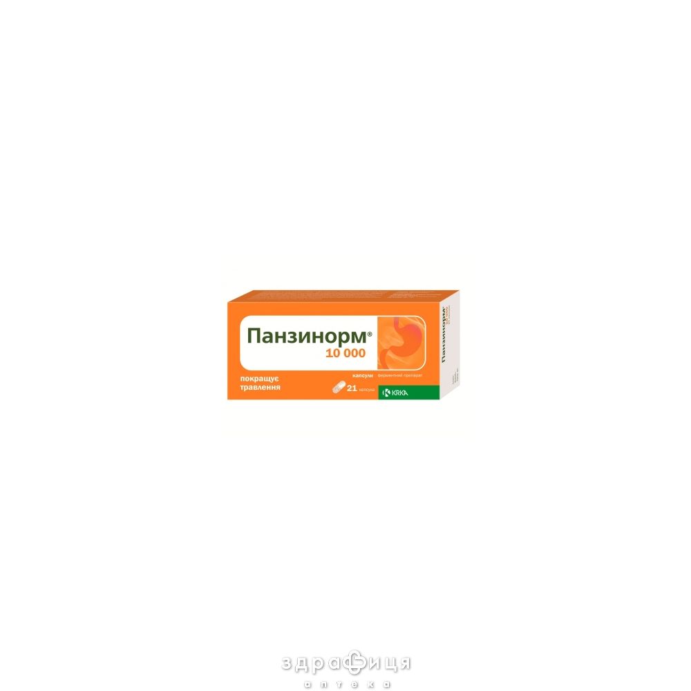 Капсули Панзинорм® 10 000 компенсують дефіцит ферментів підшлункової залози, прискорюють катаболізм та покращують клінічну картину при порушенні травлення. Активні ферменти вивільняються у тонкому кишечнику, де вони далі діють. Висока активність ліпази є ключовою у лікуванні порушень травлення, причиною яких є недостатність ферментів травлення. Ліпаза розщеплює жири до жирних кислот та моногліцеридів, що дозволяє їх всмоктування та всмоктування жиророзчинних вітамінів. Амілаза розщеплює вуглеводи до декстринів та цукрів, протеаза діє на білки. Панзинорм® 10 000 покращує живлення організму завдяки поліпшенню всмоктування різних видів їжі, а також запобігає виникненню чи зменшує стеаторею та симптоми, пов’язані з порушенням травлення. Панзинорм® 10 000 може зменшувати біль при хронічному панкреатиті. Даний ефект пов’язують із дією протеази, що зменшує секрецію підшлункової залози. Механізм цього ефекту достеменно не вивчений.