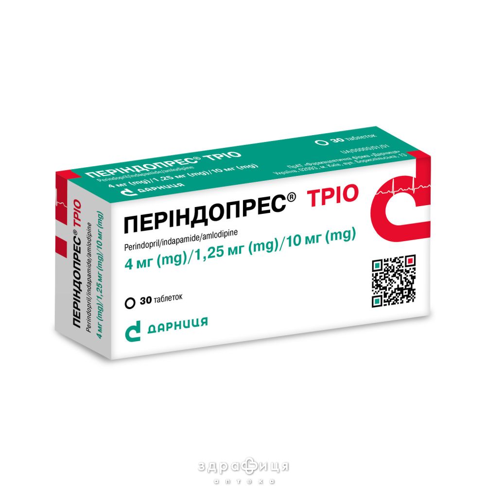 Склад | 1 таблетка містить: периндоприлу трет-бутиламіну 4 мг (що відповідає 3,338 мг периндоприлу), індапаміду 1,25 мг та амлодипіну бесилату 13,87 мг (що ві |