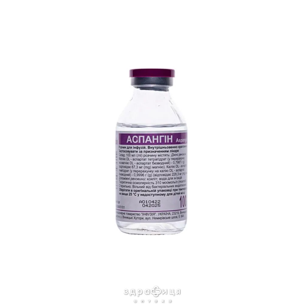 100 мл раствора содержат магния DL-аспартата тетрагидрата (в пересчете на магния DL-аспартат безводный) 0,7987 г (соответствует 67,3 мг магния); калия DL-аспартата гемигидрата (в пересчете на калия DL-аспартат безводный) 0,9996 г (соответствует 228,3 мг калия);