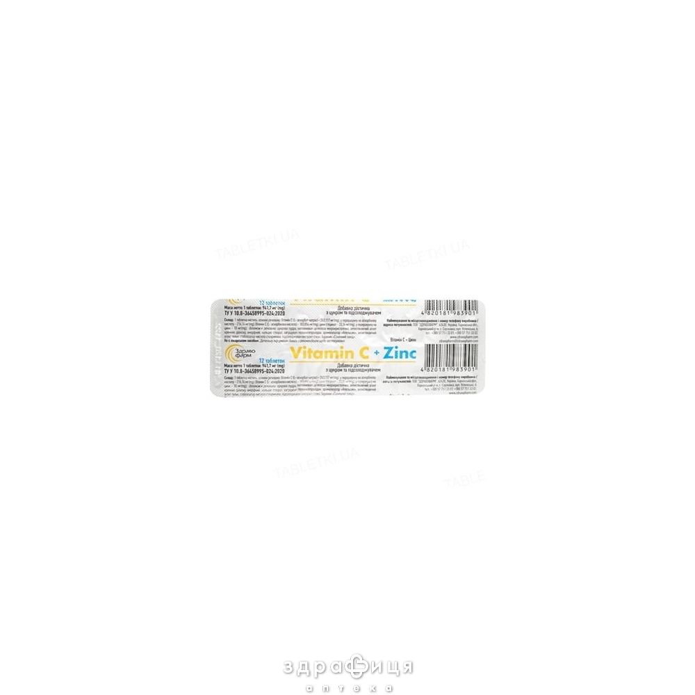 Витамин С (L-аскорбат натрия) – 243,117 мг (mg), в пересчете на аскорбиновую кислоту – 216,14 мг (mg), витамин С (L- аскорбиновая кислота) – 183,856 мг (mg), цинк глицинат – 33,34 мг (mg), в пересчете на цинк – 10 мг (mg).