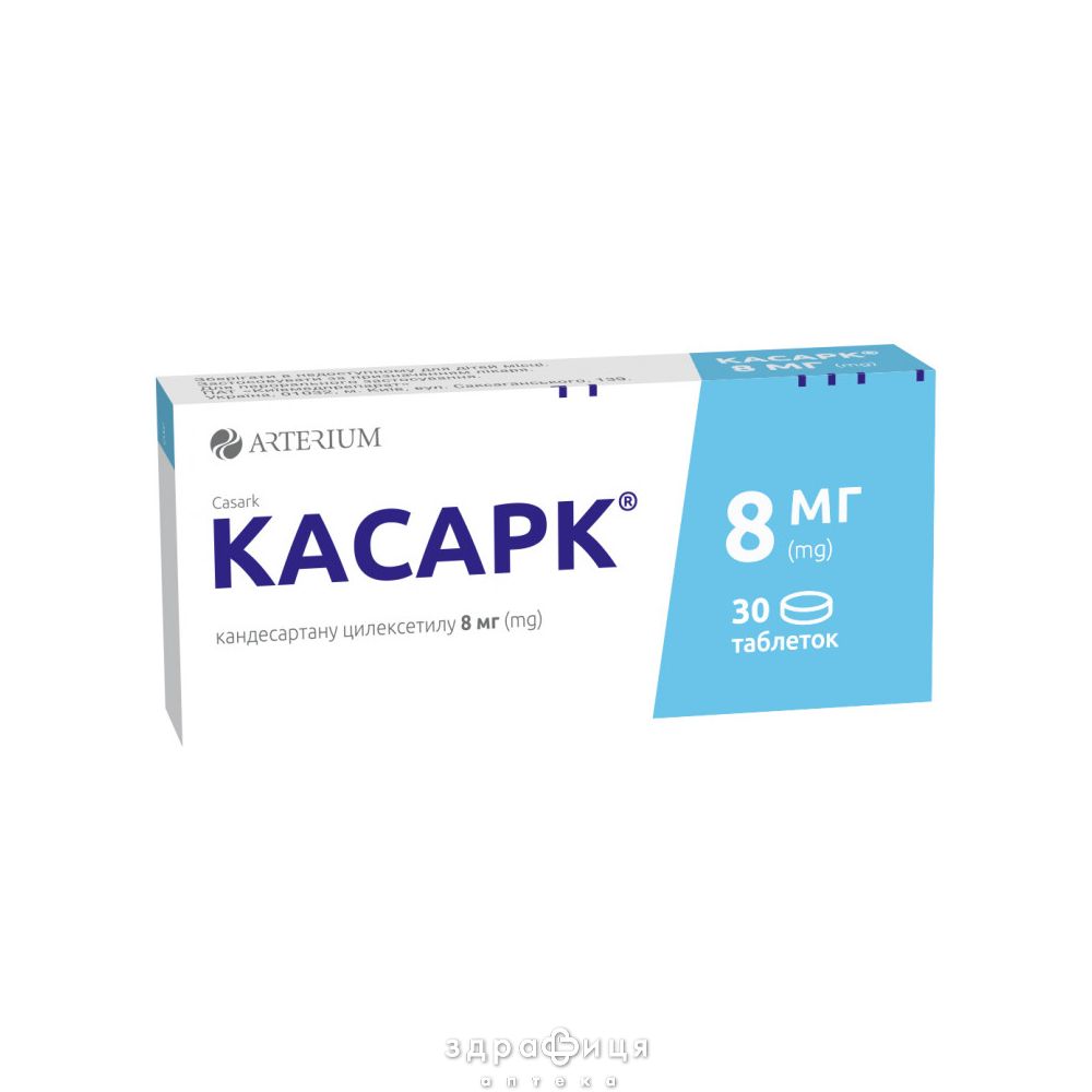 Касарк®, таблетки по 8 мг или 16 мг: таблетки белого или почти белого цвета, круглой формы, с двояковыпуклой поверхностью. На поверхности таблетки допускается мраморность.