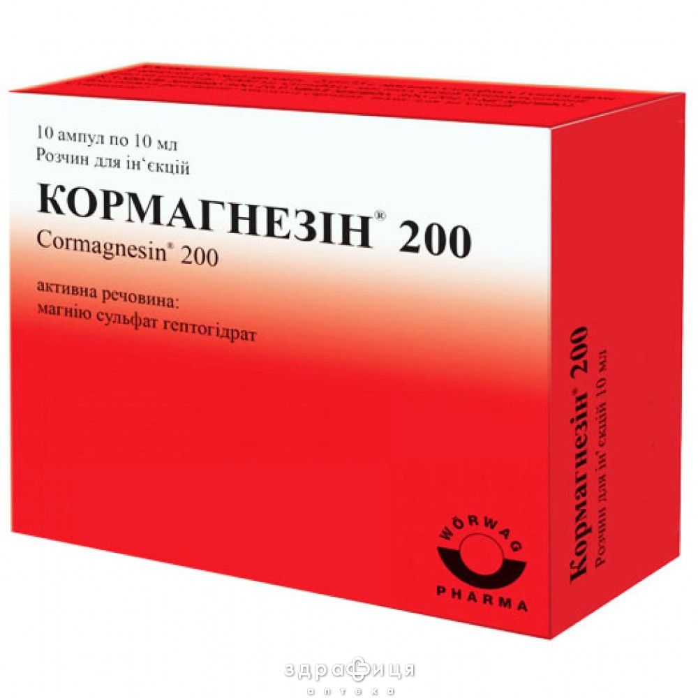 | Состав | 10 мл Кормагнезіну® 200 містить 2,0475 г магнію сульфату гептогідрату (що відповідає 1000 мг сульфату магнію, який еквівалентний 8,3 ммоль магнію або 16,6 мвал магнію, або 201,9 мг магнію) |