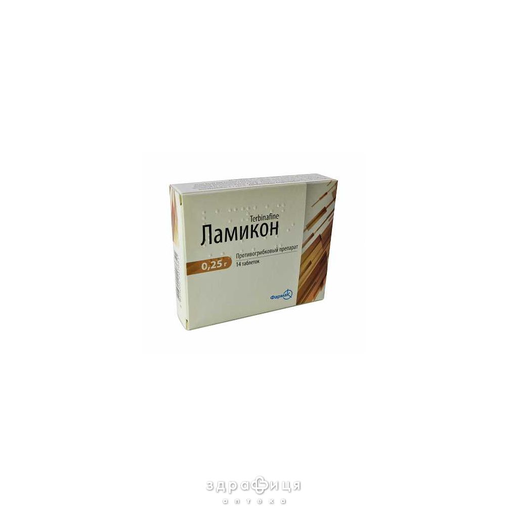 Фармакокинетика. После перорального приема тербинафин хорошо всасывается (> 70 %); абсолютная биодоступность тербинафина, входящего в состав Ламикона, таблетки, в результате пресистемного метаболизма составляет около 50 %. Разовая пероральная доза 250 мг тербинафина показала среднее значение пиковых концентраций в плазме крови – 1,30 мкг/мл через 1,5 часа после приема препарата. В равновесном состоянии по сравнению с одноразовой дозой максимальная концентрация тербинафина в плазме крови (Сmax) была в среднем на 25 % выше, а площадь под фармакокинетической кривой «концентрация–время» (AUC) в плазме крови увеличивалась в 2,3 раза. На основании увеличения плазменной AUC может быть рассчитан эффективный период полувыведения (~30 часов). Прием пищи оказывает умеренное влияние на биодоступность тербинафина (увеличение AUC на менее чем 20 %), но не настолько, чтобы требовать коррекции дозы. Одновременное употребление пищи с высоким содержанием жиров замедляет всасывание тербинафина и увеличивает биодоступность примерно на 20 %.