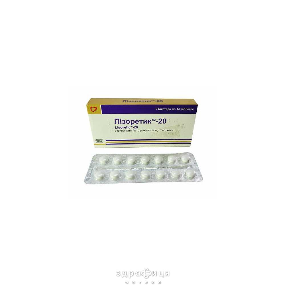 | Состав | 1 таблетка (Лізоретик™ – 20) містить: лізиноприлу дигідрату у перерахуванні на лізиноприл 20 мг та гідрохлортіазиду 12,5 мг |