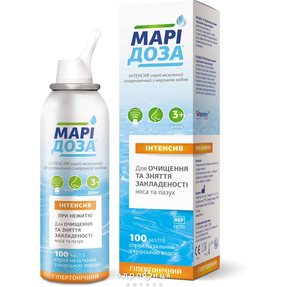 Маридоза Интенсив назальный гипертонический спрей с морской водой используется для улучшения проходимости носовых ходов и пазух. Натуральный гипертонический раствор морской воды, содержащийся в продукте, очищает носовую полость и пазухи и уменьшает отек слизистой носа и пазух, что приводит к улучшению проходимости носовых ходов и околоносовых пазух.