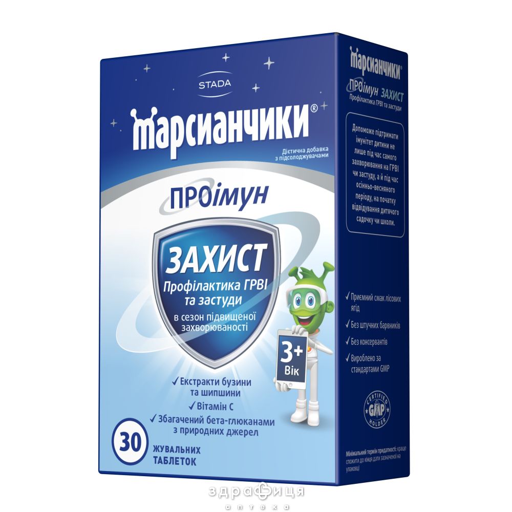 Марсианчики ПРОиммун Защита обогащены бета-глюканом, который в естественных условиях содержится в дрожжах (Saccharomyces cerevisiae). Сироп имеет приятный вкус бузины, таблетки жевательные — лесных ягод, и не содержат сахара, поэтому не оказывают вредного воздействия на эмаль детских зубов. Содержание питательных веществ в добавке Марсианчики ПРОиммун Защита тщательно оптимизировано с учетом потребностей детей. Марсианчики ПРОиммун Защита не содержат искусственных красителей, консервантов и произведены по стандартам GMP.