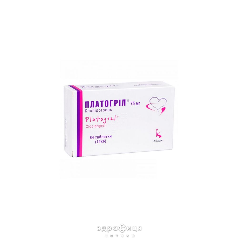 Количество в упаковке 6 шт Торговое название ПЛАТОГРИЛ Фармакотерапевтическая группа Ингибиторы агрегации тромбоцитов, кроме гепарина. Состав 1 таблетка містить клопідогрелю бісульфату у перерахуванні на клопідогрель 75 мг Форма выпуска таблетки, вкриті оболонкою, по 75 мг, по 14 таблеток у блістері; по 2 або по 4 або по 6 блістерів у картонній упаковці Международное непатентованное наименование (МНН) Clopidogrel Анатомо-терапевтическо-химическая (АТХ) классификация B - Препараты, влияющие на кроветворение и кровь