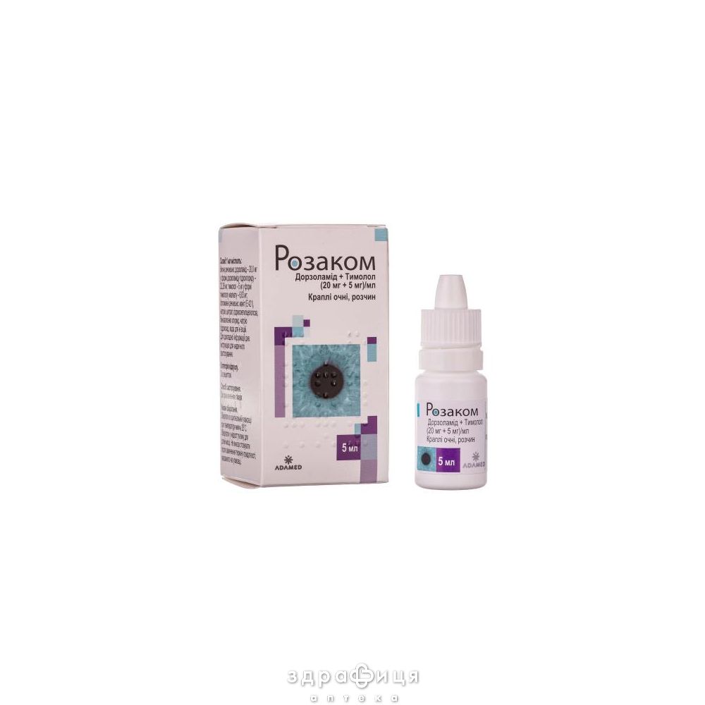 Розаком містить дорзоламіду гідрохлорид та тимололу малеат, які знижують підвищений внутрішньоочний тиск шляхом зменшення виділення водянистої рідини, однак механізм їх дії відрізняється.