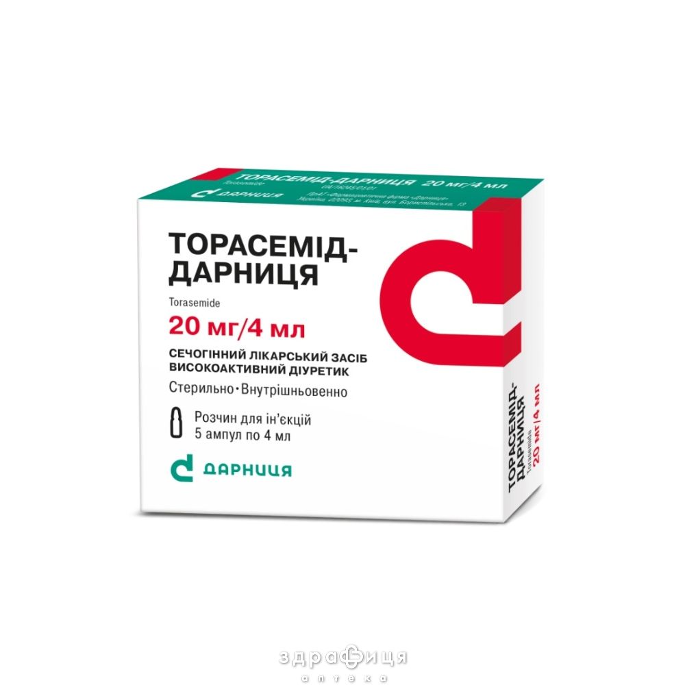 1 ампула (4 мл) раствора для инъекций содержит торасемида, безводного в пересчете на 100 % сухое вещество – 20 мг;