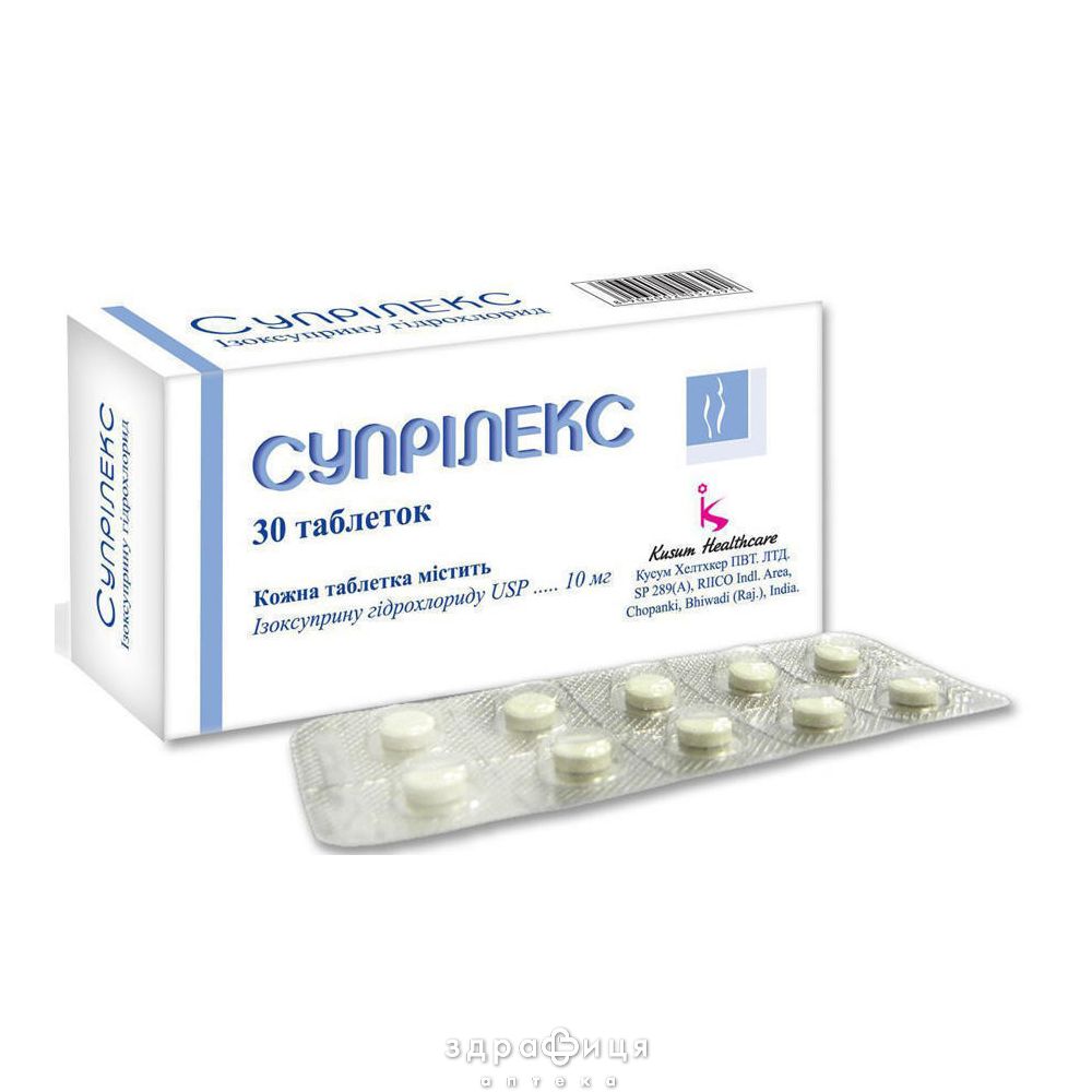 Супрiлекс таблетки використовуються для лікування порушень периферичного кровообігу різного ґенезу, таких як спазми артерій кінцівок, облітеруючий ендартеріїт, атеросклероз артерій кінцівок, діабетична ангіопатія, хвороба і синдром Рейно. Вони також ефективні при хронічній церебральній судинній недостатності, атеросклерозі артерій сітківки та загрозі передчасних пологів.