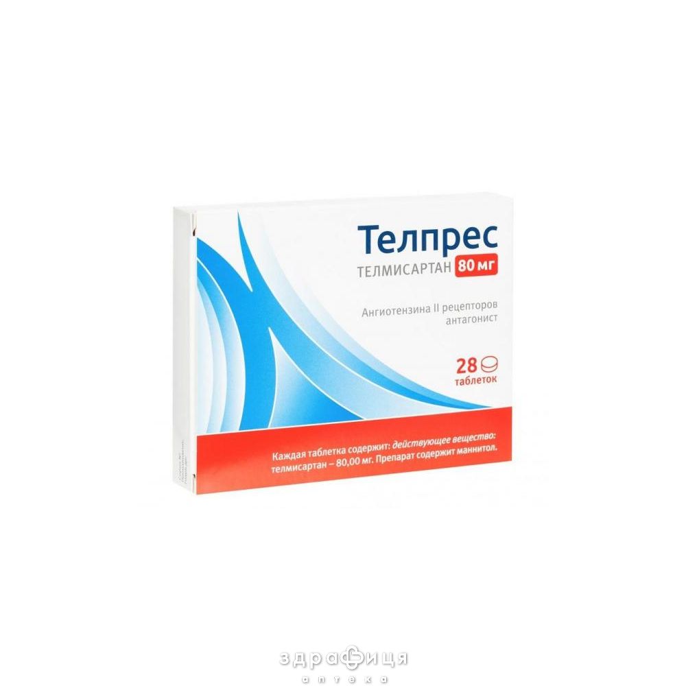 Загальна частота проявів побічних реакцій у пацієнтів з артеріальною гіпертензією в ході досліджень при прийомі телмісартану зазвичай була порівняна з такою при прийомі плацебо (41,4 % порівняно з 43,9 %). Частота проявів побічних реакцій не є дозозалежною та не має зв’язку зі статтю, віком або расою пацієнтів. Дані щодо безпеки препарату Телпрес при попередженні серцево-судинних захворювань були порівнянними з даними при лікуванні артеріальної гіпертензії.
