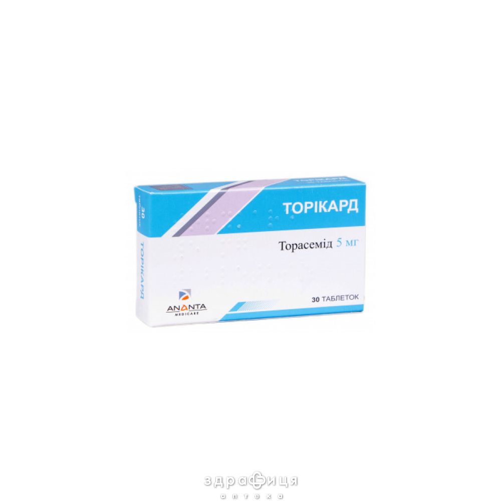 Торікард, таблетки по 5 мг: від білого до майже білого кольору, овальної форми таблетки з рискою та тисненням "5" і "6" з одного боку, тисненням Н, з іншого.