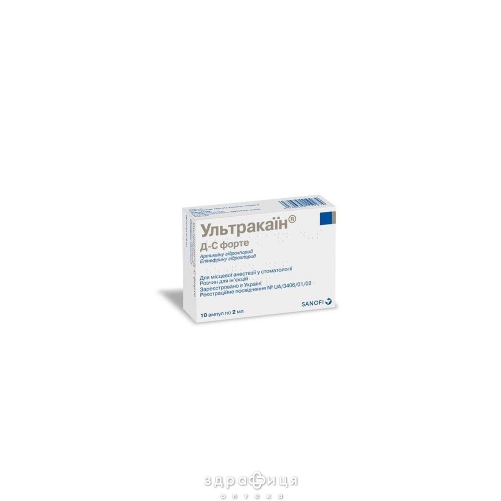 Фармакодинаміка. Ультракаїн® Д-С форте – місцевий анестетик амідного типу, який застосовують у стоматології для інфільтраційної та провідникової анестезії. Препарат має швидкий початок дії (латентний період – 1-3 хвилини), сильний знеболювальний ефект. Тривалість ефективної анестезії становить приблизно 75 хвилин.