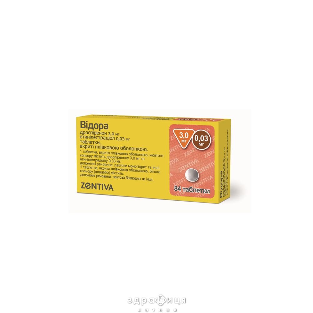 Препарат Відора – це КОК з етинілестрадіолом та прогестогеном дроспіреноном. У терапевтичних дозах дроспіренон виявляє антиандрогенні та помірні антимінералокортикоїдні властивості. Він не має естрогенної, глюкокортикоїдної та антиглюкокортикоїдної активності. Отже, дроспіренон має схожий фармакологічний профіль із природним прогестероном.